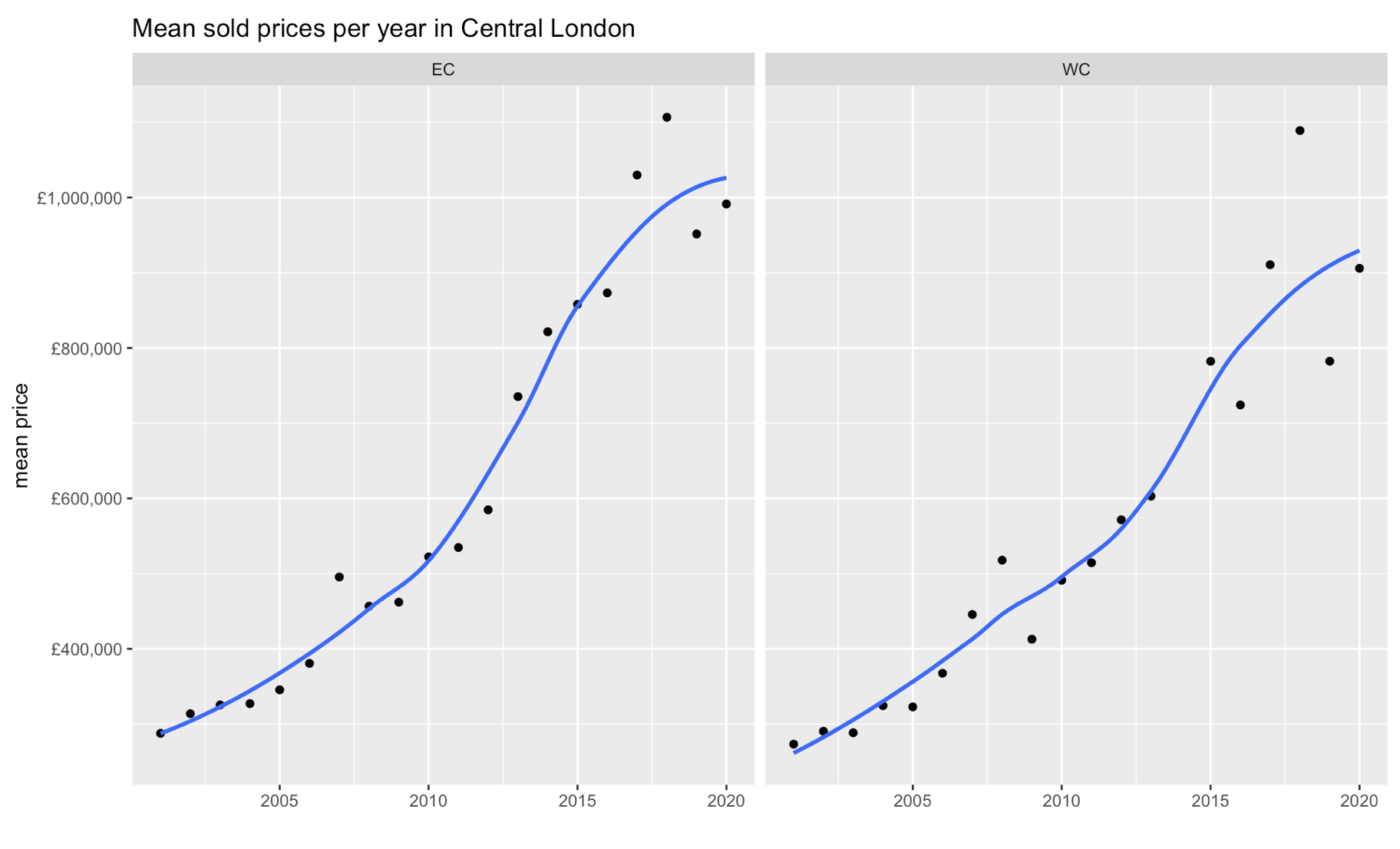Median prices in 2020 were slightly up in both EC & WC postcodes compared to 2019, and near long term price trend price (in blue). I chose to use median prices as they are less affected by outlier prices of superstar properties compared to the mean average. Nevertheless, both averages (median and mean) show the same trend (see mean below).