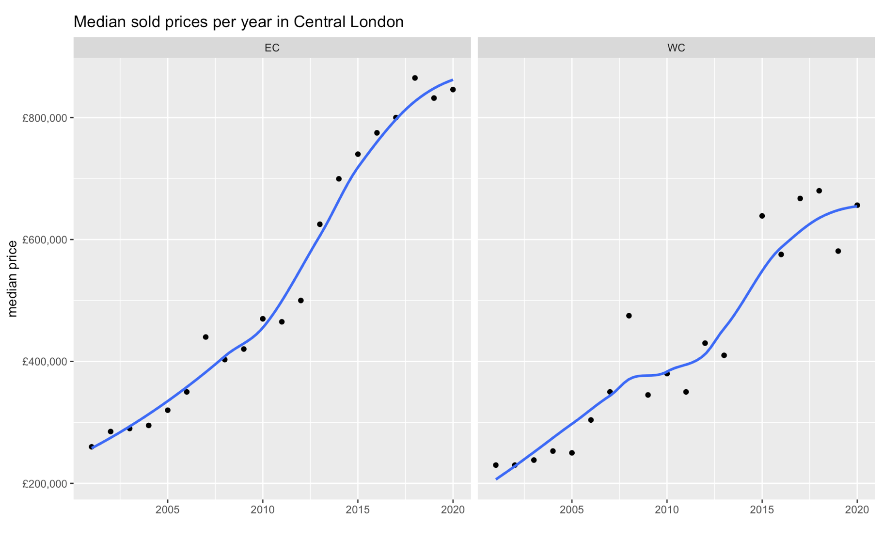 In the UK, the Office of National Statistics does a great job in calculating the house price inflation. However, it lacks detailed analysis of Central London property located in EC & WC postcodes. The average price of properties in this postcode is over £1m, more than 3x the national average and hence follows a different market dynamic. For e.g. the stamp duty holiday has a much smaller effect on total property price.