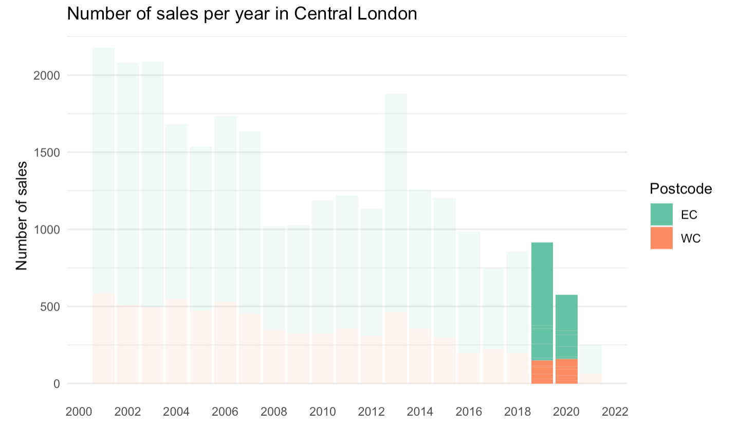 According to the ONS report, number of sales of flats fell 30% in England in 2020 compared to 2019 (most houses in EC/WC are flats). Hence a drop of 40% in 2020 in both EC & WC is significantly larger and hints at a weaker market.